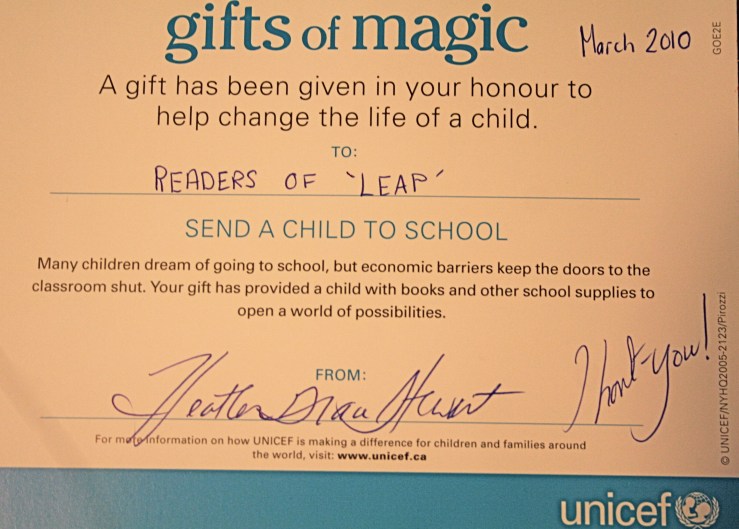 Thank you, dear readers. Through sales of ‘Leap‘ in March 2010 alone (its first month out there in the world), I was able to donate to Unicef’s Gift of Education program, and we sent another child to school. But so much more could be accomplished, and it doesn’t take much. Please share with others your love of the books “Where the Butterflies Go” and “Leap.” Together, let’s send