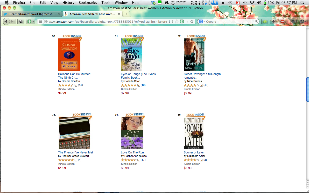 It’s probably good I’m preoccupied with her being ill because I can’t really wrap my head around how fast Three Spaces flew up the charts ON THE SAME DAY that The Friends I’ve Never Met charted in Women’s Fiction, in the subcategory Action and Adventure!Last I looked, it was #33 on Amazon.com Kindle, and #36 in Single Women on Amazon.ca Kindle. It’s alongside the likes of Sophie Kinsella and Helen Fielding (Mad About the Boy is #1 in Single Women Fiction ) so I am in great company and completely ..well..freaking out, despite that I need to go to bed!
